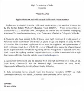 க.பொ.த உயர்தர பட்ட படிப்பு கற்கை நெறிகள் மற்றும் இலங்கையின் ஏதேனும் அரசாங்க தொழிநுட்ப கல்லூரிகளில் தொழிநுட்ப கல்வியை மேற்கொள்ளும் பெருந்தோட்ட தொழிலார்களின் பிள்ளைகளுக்கான புலமை பரிசில்களுக்கு இலங்கை பெருந்தோட்டத் தொழிலாளர் கல்வி நிதியத்திடம் (CEWET ) விண்ணப்பம் கோரப்பட்டுள்ளது.