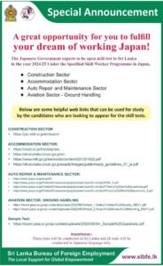 ஜப்பானிய அரசாங்கம் நான்கு துறைகளில் வேலைவாய்ப்புக்கு திறந்த போட்டி பரீட்சைக்கான விண்ணப்பங்களை கோரியுள்ளதாக வெளிநாட்டு வேலைவாய்ப்பு பணியகம் அறிவித்துள்ளது .