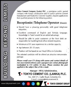 Receptionist / Telephone Operator Vacancies – Tokyo Cement Company (Lanka) PLC (Paper Notice) Female
