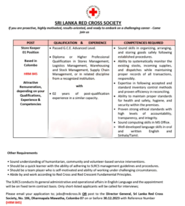 SRI LANKA RED CROSS-STORE KEEPER Vacancies 2023